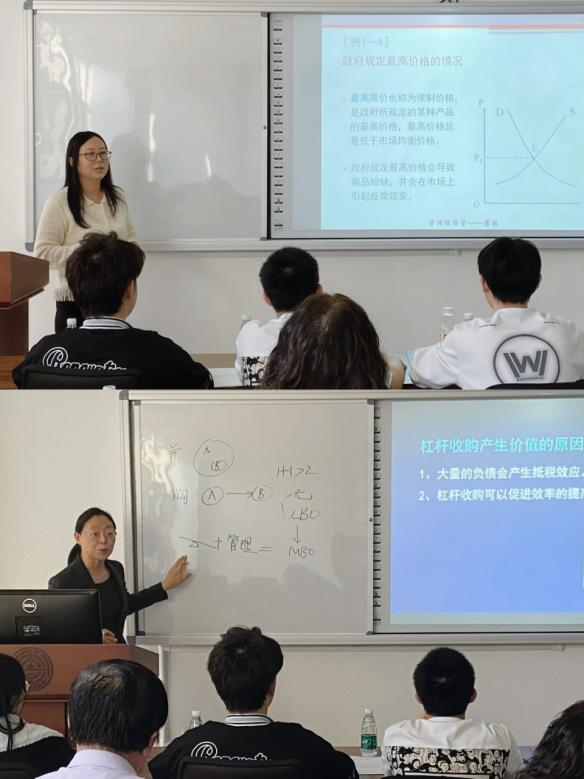 通过前期教学资料提交、课堂教学效果评价两个环节,崔丽老师、郎香香老师顺利进入最终的认证环节,两位老师就教学内容、教学方法、取得的成果和改进措施等进行汇报,并分别围绕《管理经济学》、《财务管理》两门课程进行课堂教学展示。讲课过程中,两位老师贯彻教学相长理念,注重与听课学生的交流互动,提出知识、思维、能力、素质四点教学目标,并运用案例分析法生动讲解专业知识。